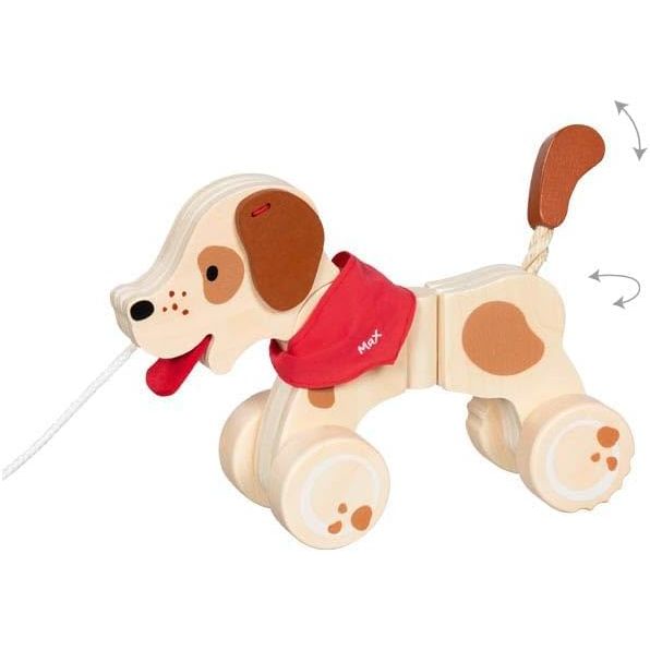 - Ziehtier Hund „Max“ – fröhlich gestalteter Holzhund mit beweglichen Rädern und wackelndem Schwanz