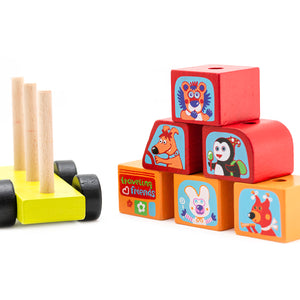 Dieses Spielzeug besteht aus beweglichen Rädern und 6 Blöcken, die nach dem Pyramidenprinzip an der Basis befestigt sind.