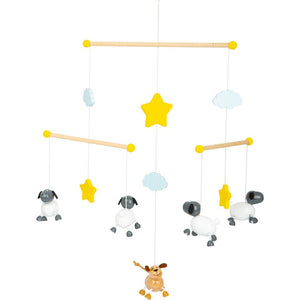 Auf dem Weg ins Traumland! Mit diesem Mobile ziehen vier Schäfchen und ein Hütehund ins Kinderzimmer ein. Zwischen Sternen und Wolken schaukeln die Tierfiguren aus Holz am Mobile beruhigend hin und her. So wecken die liebevoll gestalteten Tierchen Babys Neugierde und ziehen die volle Aufmerksamkeit auf sich. Schäfchenzählen leicht gemacht!
