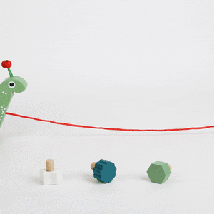 Die Steine können am Gewinde auf der zweiten Seite des Schneckenhauses angeschraubt werden – dank farblicher Markierung wird zusätzlich die Farb- und Formerkennung geschult. Der Mix aus naturbelassenem Holz und moderner Farbgebung, macht das Ziehtier zum absoluten Hingucker!