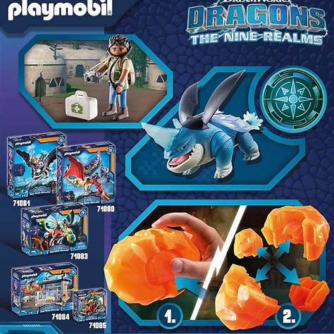 Willkommen in der geheimen Welt der Drachen! Mit dem PLAYMOBIL-Set Plowhorn & D’Angelo tauchen Kinder ab 4 Jahren tief ein in die fantastische Welt von „Dragons: The Nine Realms“. Der freundliche Drache Plowhorn – mit einem markanten Horn und beweglichen Gliedmaßen – ist der treue Begleiter von D’Angelo, dem mutigen Drachen-Doktor.