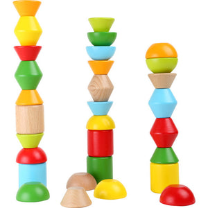 Hier wird hoch gestapelt! Bunte Bauklötze lassen sich zu verschiedenen Figuren und Bauten zusammenstellen. Wer baut mit diesen robusten Holzklötzen den höchsten Turm? Da werden ganz nebenbei Feinmotorik und Konzentration gefördert.