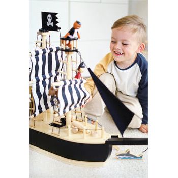 Ahoi ihr Seeräuber! Dieses detailreich gestaltete Piratenschiff aus robustem Holz lässt mit seinen vielen authentischen Details keine Wünsche offen! Das umfangreiche Spielset umfasst neben dem geräumigen Zweimaster auch ein Beiboot zum Rudern für zwei Biegepuppen, einen Hai, einen Papagei, eine Schatzkiste, eine Kanone sowie zwei Fässer, eine Planke und natürlich eine Piratenflagge. Wie bei einem echten Segelschiff lassen sich alle Segel an Seilen hissen und bergen. Für die Extraportion Spielspaß sorgt die Kanone, die ihre drei Kanonenkugeln aus Filz durch die Luft fliegen lässt!