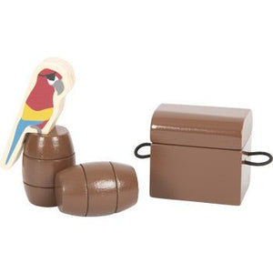 - inkl. Beiboot zum Rudern, Strickleiter, Papagei, 2 Fässer, Hai, Planke, Piratenflagge und Schatztruhe mit Deckel